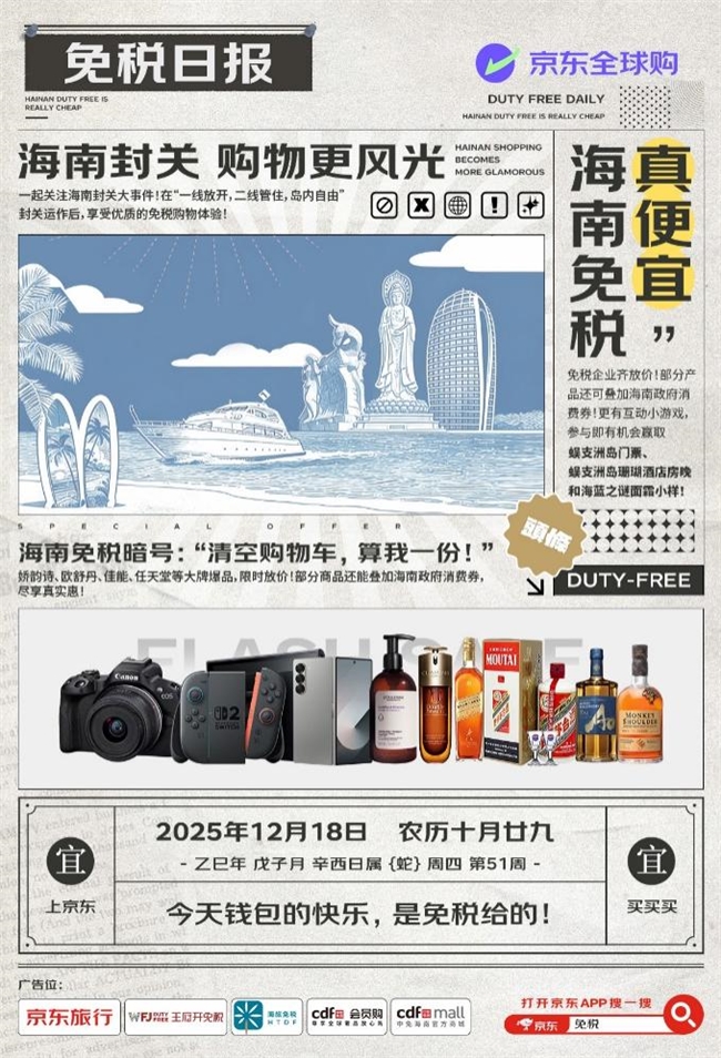 随着12月18日海南自贸港“零关税”政策全面落地的关键节点临近,京东全球购联合海南省相关部门,携手王府井免税、海旅免税、中免集团及京东酒旅,正式启动“1218海南免税真便宜”大型主题活动,为消费者解锁全球精品免税购物新体验。